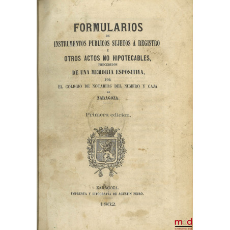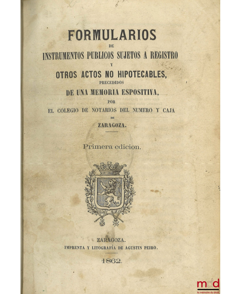 FORMULARIOS DE INSTRUMENTOS PUBLICOS SUJETOS A REGISTRO Y OTROS ACTOS NO HIPOTECABLES, PRECEDIDOS DE UNA MEMORIA ESPOSITIVA, POR EL COLEGIO DE NOTARIOS DEL NUMERO Y CAJA DE ZARAGOZA, Primera edicion