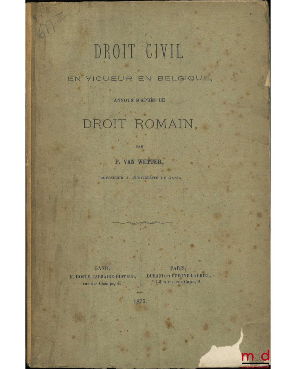 DROIT CIVIL EN VIGUEUR EN BELGIQUE, ANNOTÉ D’APRÈS LE DROIT ROMAIN