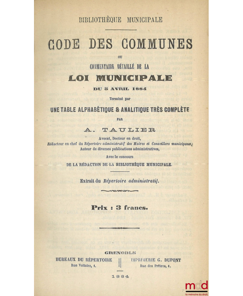CODE DES COMMUNES Ou commentaire détaillé de la loi municipale du 5 avril 1884, Terminé par une table alphabétique & analytique très complète, Avec le concours de la rédaction de la bibliothèque municipale, Extrait du Répertoire administratif.