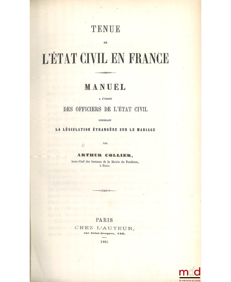 TENUE DE L’ÉTAT CIVIL EN FRANCE, Manuel à l’usage des officiers de l’état civil contenant la législation étrangère sur le mariage
