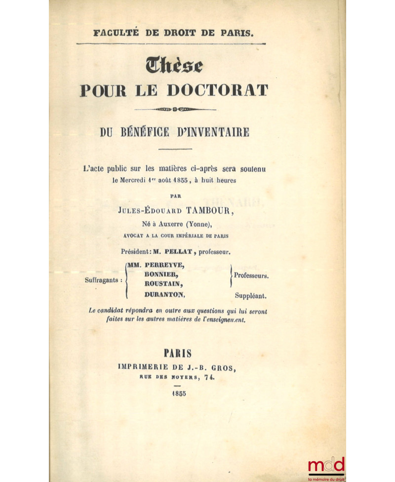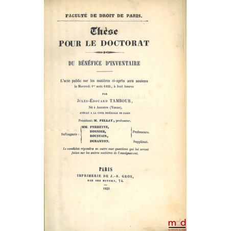 DU BÉNÉFICE D’INVENTAIRE, Thèse, Faculté de droit de Paris