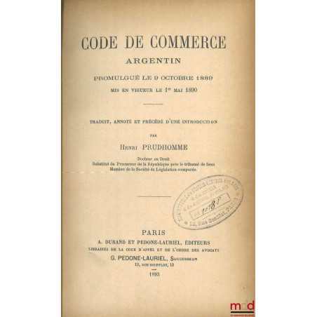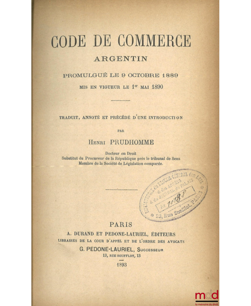 CODE DE COMMERCE ARGENTIN Promulgué le 9 octobre 1889, Mis en vigueur le 1er mai 1890, Traduit, annoté et précédé d’une introduction par Henri Prudhomme, coll. de codes étrangers, t. VI