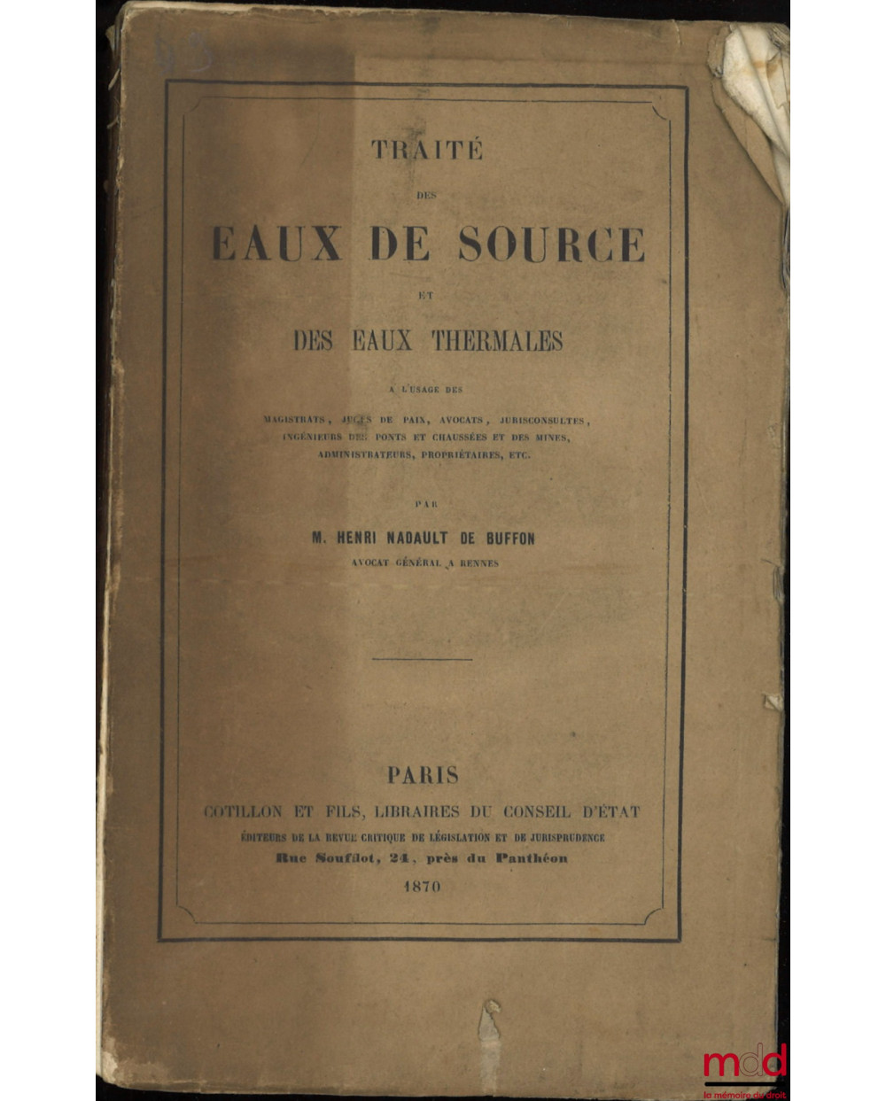 TRAITÉ DES EAUX DE SOURCE ET DES EAUX THERMALES à l’usage des magistrats, juges de paix, avocats, jurisconsultes, ingénieurs des ponts et chaussées et ines, administrateurs, propriétaires, etc.