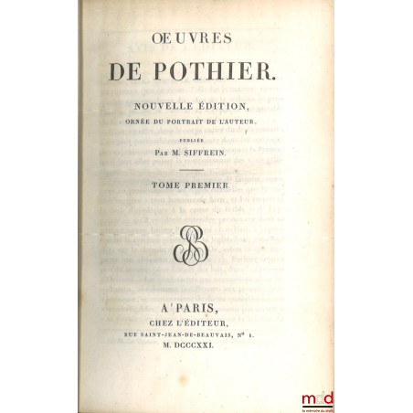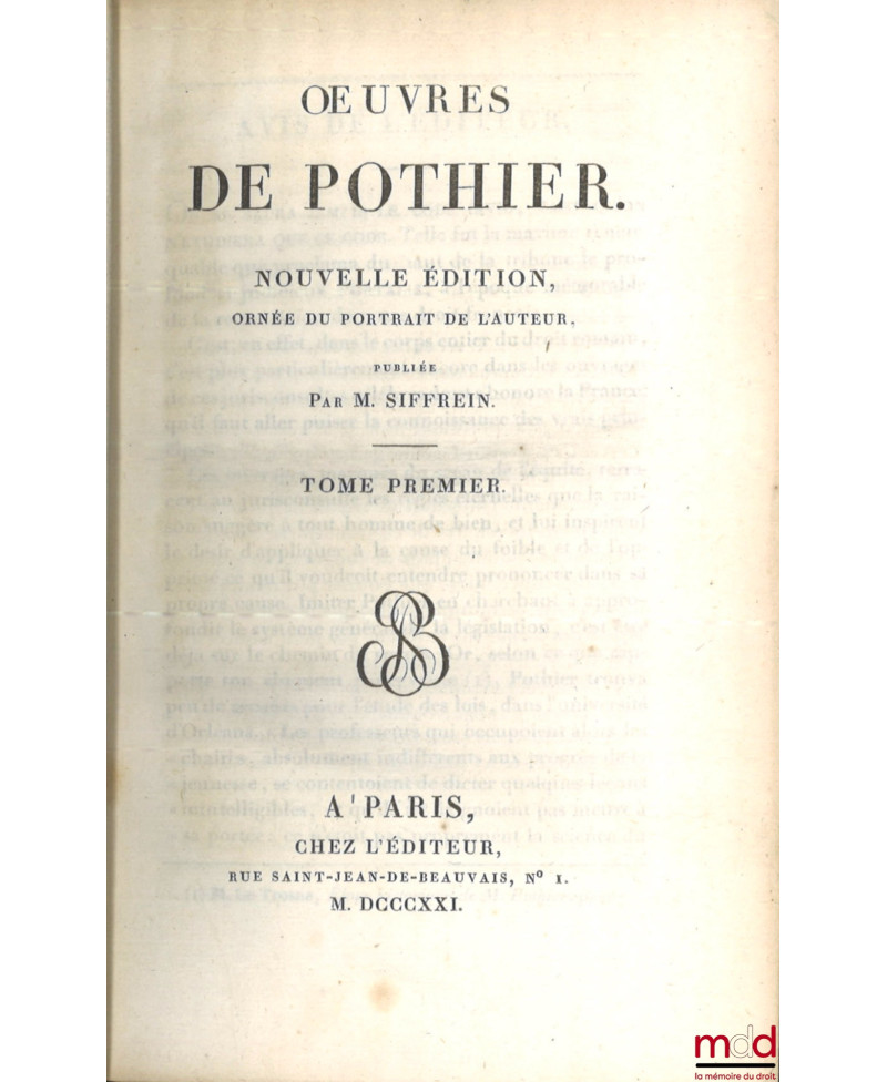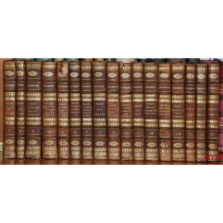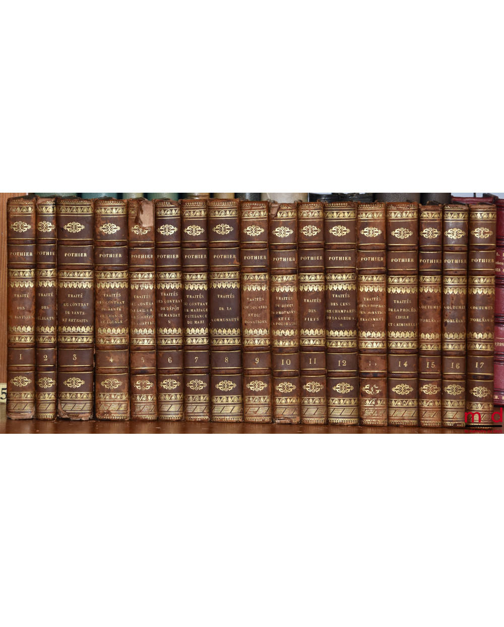ŒUVRES DE POTHIER. NOUVELLE ÉDITION, ornée du portrait de l’auteur, publiée par M. Siffrein :t. I & II : Obligations (1821) ; t. III : Contrat de Ventes et Retraits (1821) ; t. IV : Contrat de constitution de Rente, Contrat de Change, Contrat de Louage et Supplément (1821) ; t. V : Contrats de Bail à rente, de Société, des Cheptels, de Bienfaisance, du Prêt à usage et du Prêt de Consomption (1821) ;t. VI : Contrat de Dépôt, Mandat, Nantissement, Assurance, Prêt & Jeu (1821) ; t. VII : Contrat de mariage et de la puissance du mari (1822) ; t. VIII : Traité de la Communauté (1822) ;t. IX : Traités du douaire et des Donations (18821) ;t. X : Droit de Domaine de propriété, de la Possession, de la Prescription qui résulte de la possession (1821) ; t. XI : Traité des fiefs (1821) ; t. XII : Traité des Cens, des Champarts, de la Garde-noble et Bourgeoisie, du Préciput légal des Nobles, de l’Hypothèque, des Substitutions et des Successions (1822) ; t. XIII : Traités des propres, des donations testamentaires, des donations entre-vifs, des personnes et des choses (1823) ; t. XIV : Traité de la Procédure civile et criminelle (1821) ;t. XV : Coutumes d’Orléans - Ier (1821) ;t. XVI : Coutumes d’Orléans - IIe (1822) ;t. XVII : Coutumes d’Orléans - IIIe (1822)