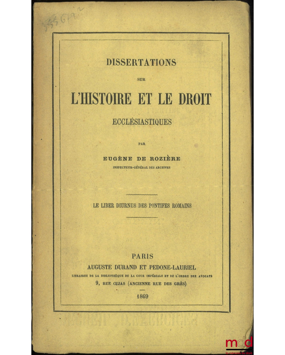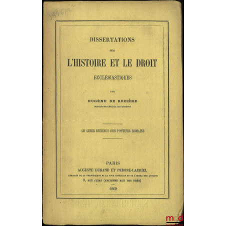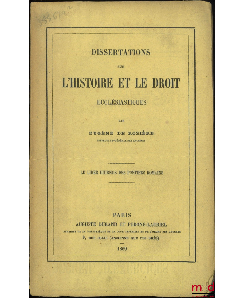 DISSERTATION SUR L’HISTOIRE ET LE DROIT ECCLÉSIASTIQUES, Le liber diurnus des pontifes romains, ext. de la Revue historique de Droit français et étranger, années 1868 et 1868