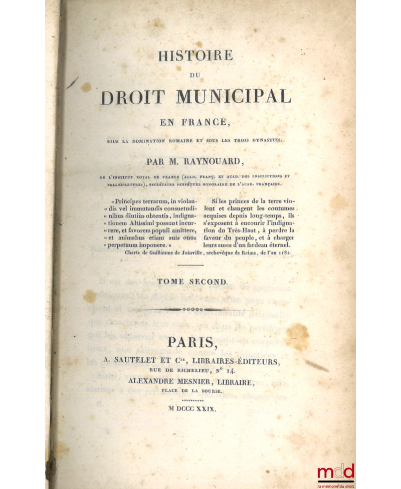 HISTOIRE DU DROIT MUNICIPAL EN FRANCE SOUS LA DOMINATION ROMAINE ET SOUS LES TROIS DYNASTIES, [mq. t. I]