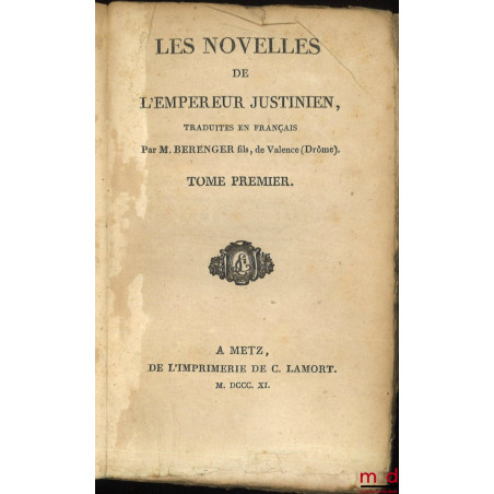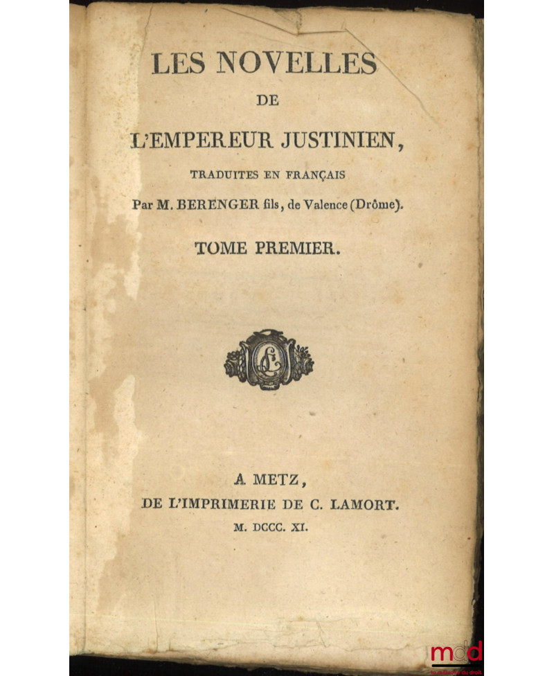 LES NOVELLES DE L’EMPEREUR JUSTINIEN, Traduites en français par M. Berenger fils, de Valence (Drôme) :t. I, II et III : 1811t. IV et V : 1807t. VI, VII et VIII : 1810