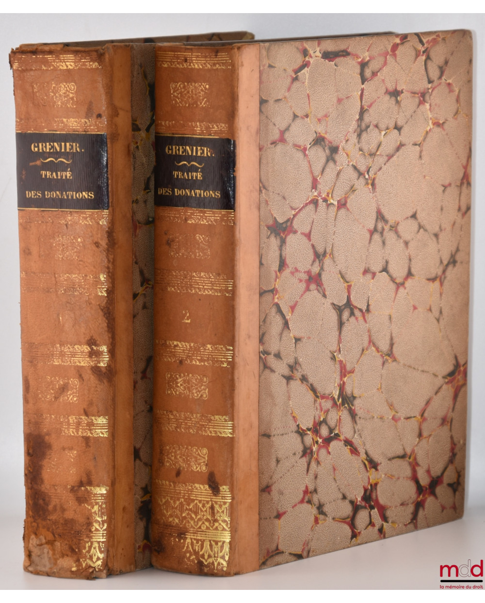 On n’imaginait pas que la matière des donations puisse donner lieu à un ouvrage de cette ampleur. Toutefois Dramard (n° 1708) souligne que "l’ouvrage de G. a été longtemps le meilleur sur cette partie du Code". Il comprend également un traité de l’adoption et un traité de la tutelle officieuse accompagnés d’un discours historique sur le droit de l’adoption. Quoique ne faisant pas partie de l’école de la Thémis Grenier fut un des auteurs les plus appréciés par cette revue (v. par ex. les articles d’Athanase Jourdan, T. V, P. 37), il s’inscrit d’ailleurs clairement dans une optique historiciste comme en témoigne son chapitre introductif "discours historique sur l’ancienne législation relative aux donations, testaments et à toutes autres dispositions à titre gratuit" qui est une réflexion générale sur le statut des contrats peu courante dans les textes de la première exégèse. Il est à noter que le dos de l’ouvrage a été relié avec des actes notariés sur parchemin du XVIIIème siècle.