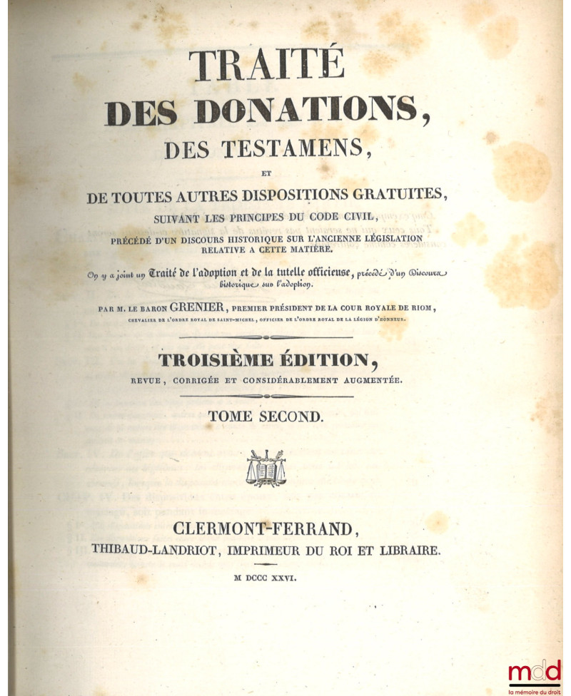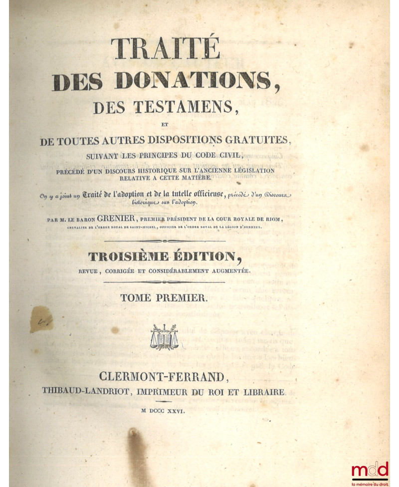 TRAITÉ DES DONATIONS, DES TESTAMENS, ET DE TOUTES AUTRES DISPOSITIONS GRATUITES, SUIVANT LES PRINCIPES DU CODE NAPOLÉON, PRÉCÉDÉ D’UN DISCOURS HISTORIQUE SUR L’ANCIENNE LÉGISLATION RELATIVE À CETTE MATIÈRE, On y a joint un Traité de l’adoption et de la tutelle officieuse, précédé d’un Discours historique sur l’adoption, 3e éd., revue, corrigée et considérablement augmentée.