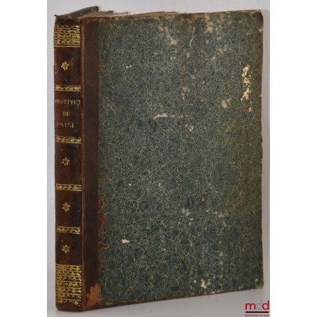 Description : in-16, demi-basane brune, tit. doré sur dos lisse orné de fleurons et frises dorés, non massicoté, (ouvrage fané, rel. et plats frottés avec épidermures, des trous de vers traversants, mors partielt fendus), [ce livre provient de la bibliothèque personnelle de Bernard Pacteau], 48-61-43 p.