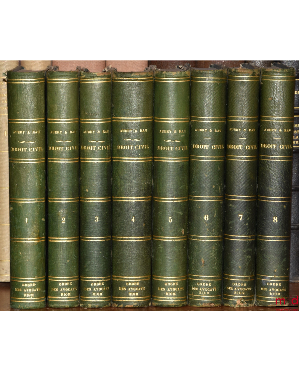 Description : 8 vol. in-8, demi-chagrin vert empire, tit. et tom. dorés sur dos lisse orné de double filets soulignats dorés, rel. au nom de l’ « Ordre des avocats de Riom », tr. mouchetées, (rel. très usées avec de nombreuses mais lég. épidermures, coupes frottées et coins très émoussés voire arrachés, marques de tampons, t. IV : lég. mq. de papier sur les premières p.), int. frais, VIII-654 / 543 / 552 / 784 / 652 / 745 / 559 / 628 p.