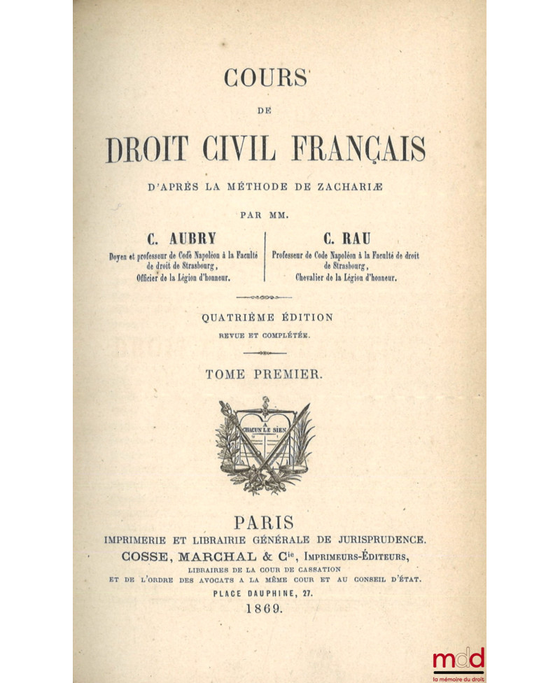 COURS DE DROIT CIVIL FRANÇAIS D’APRÈS LA MÉTHODE DE ZACHARIÆ, 4e éd. revue et complétée