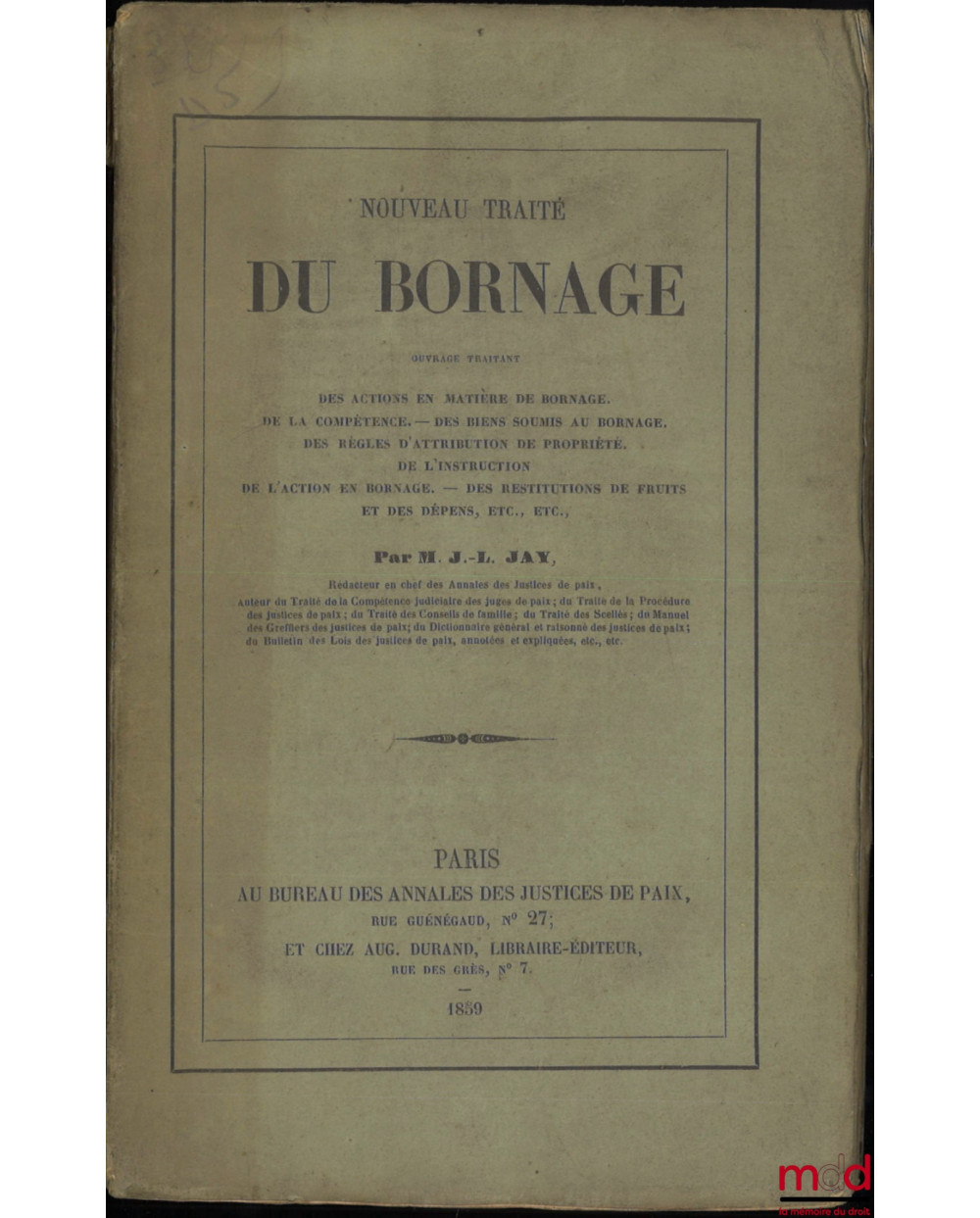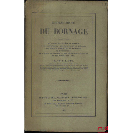 NOUVEAU TRAITÉ DU BORNAGE, Ouvrage traitant des actions en matière de bornage. De la compétence. Des biens soumis au bornage. Des règles d’attribution de la propriété. De l’instruction. De l’action en bornage. Des restitutions de fruits et des dépens, etc., etc.