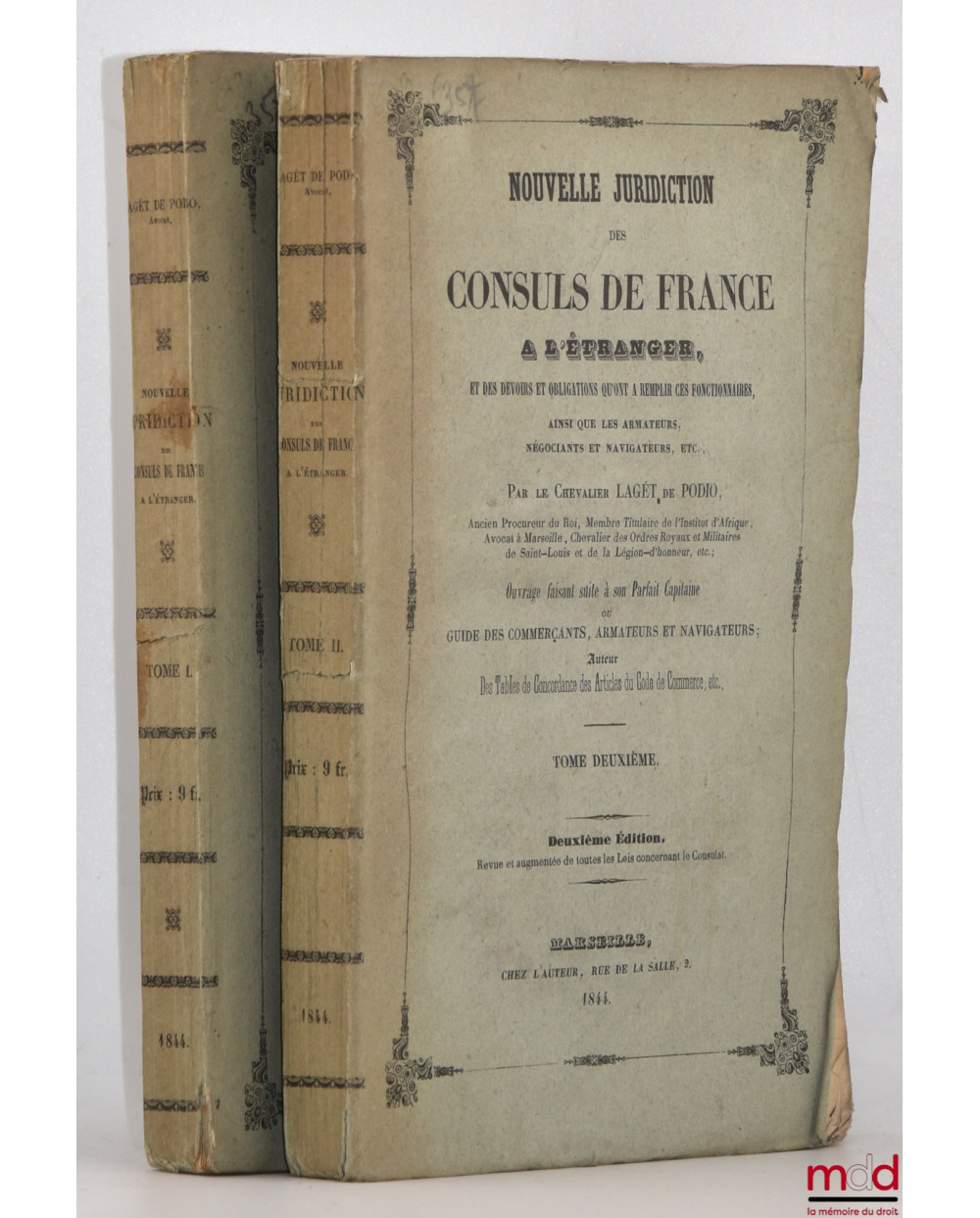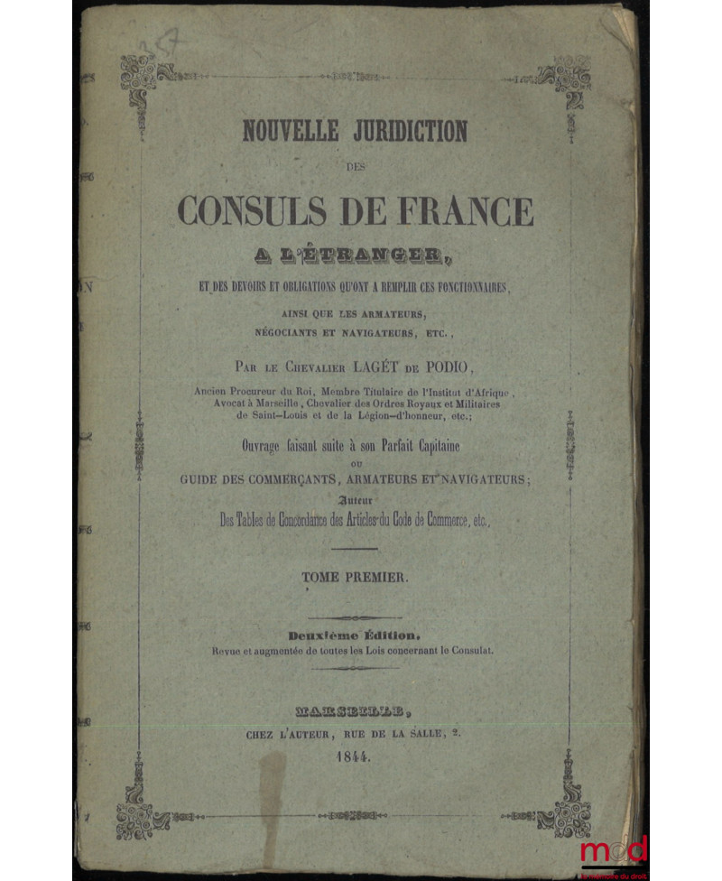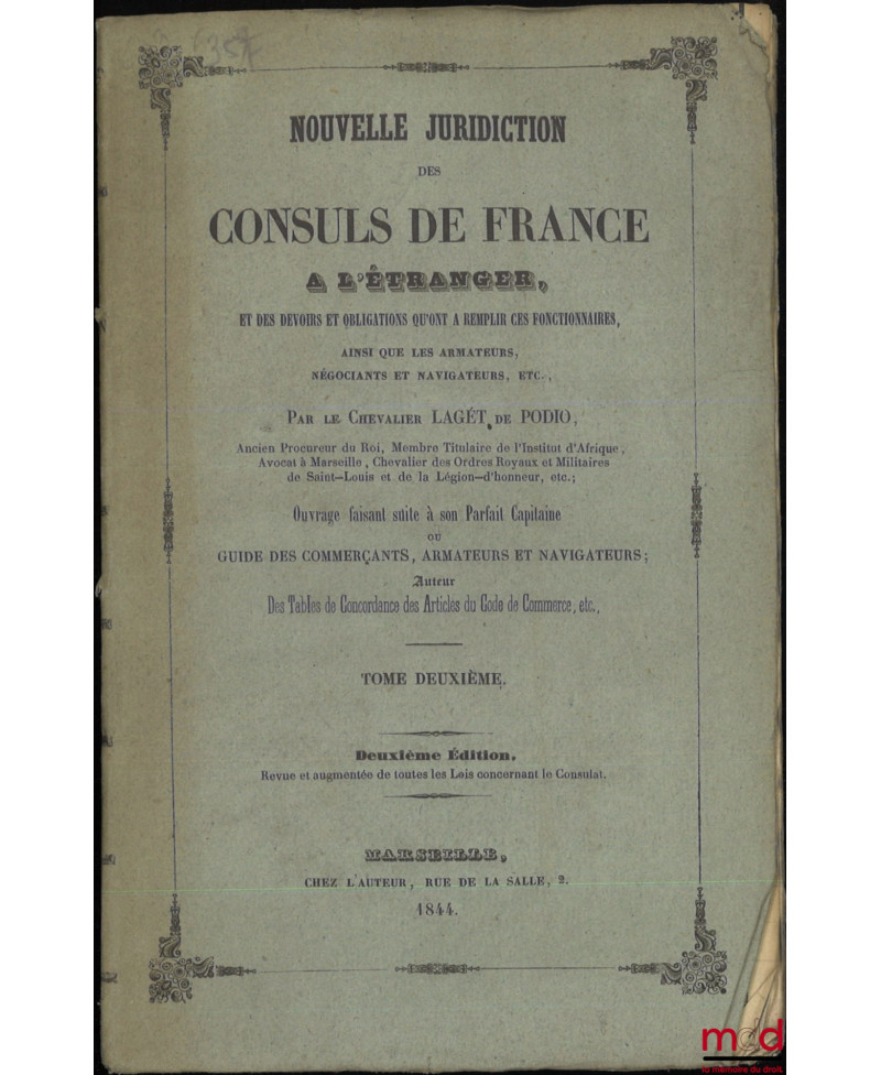 NOUVELLE JURIDICTION DES CONSULS DE FRANCE À L’ÉTRANGER, et des devoirs et obligations qu’ont à remplir ces fonctionnaires, ainsi que les armateurs, négociants et navigateurs, etc., Ouvrage faisant suite à son Parfait Capitaine ou Guide des commerçants, armateurs et navigateurs ; Auteur des Tables de concordance des Articles du Code de Commerce, 2e éd. revue et augmentée de toutes les Lois concernant le Consulat