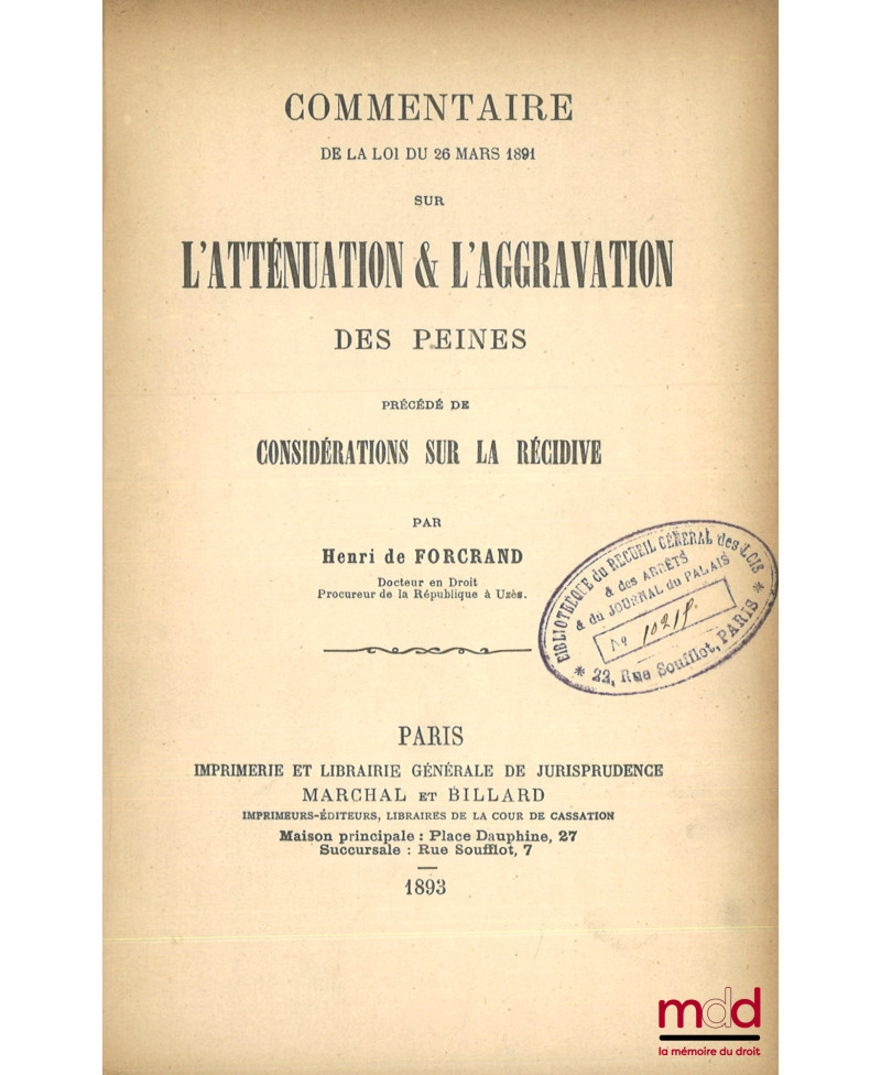 COMMENTAIRE DE LA LOI DU 26 MARS 1891 SUR L’ATTÉNUATION & L’AGGRAVATION DES PEINES, Précédé de considérations sur la récidive
