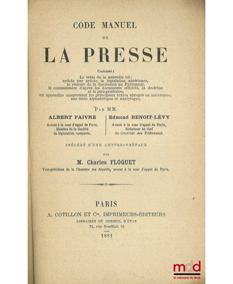 CODE MANUEL DE LA PRESSE, Contenant : Le texte de la nouvelle loi ; article par article, la législation antérieure, le résumé de la discussion au Parlement, le commentaire d’après les documents officiels, la doctrine et la jurisprudence, un appendice comprenant les principaux textes abrogés ou maintenus ; une table alphabétique et analytique, Précédé d’une lettre-Préface par M. Charles Floquet