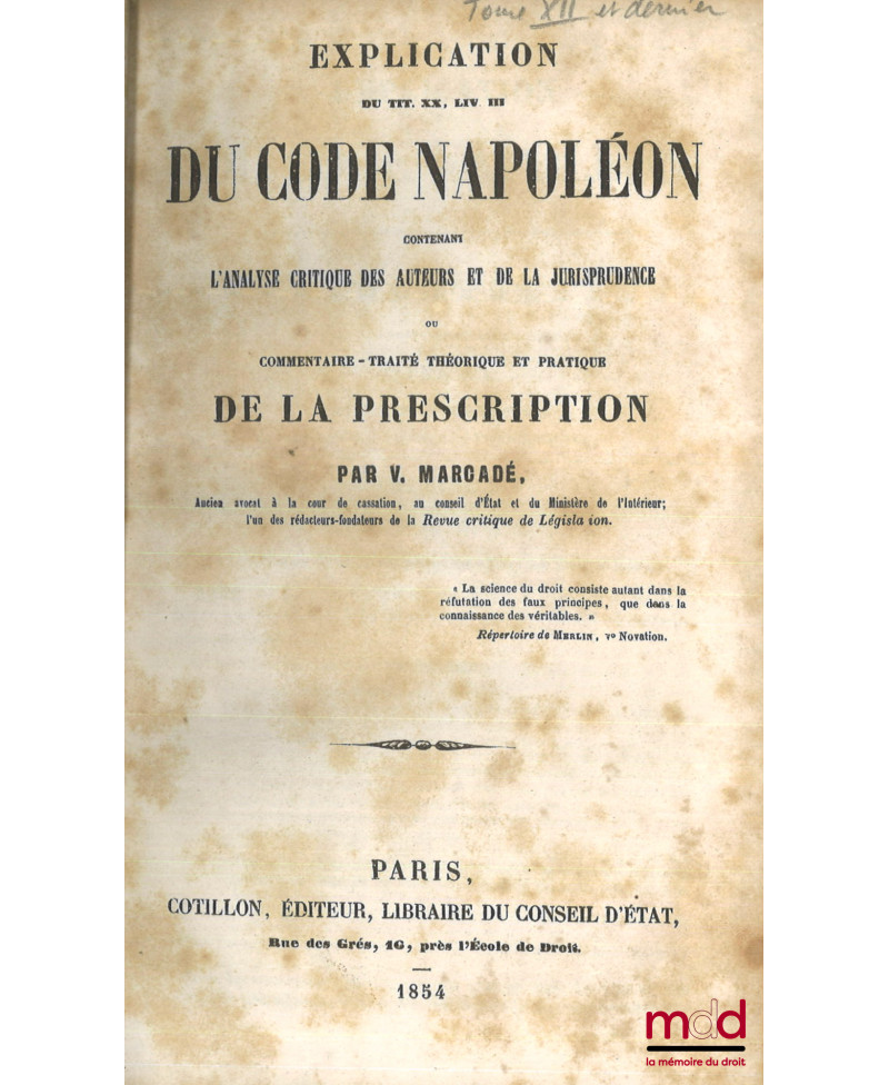 EXPLICATION DU TITRE XX, LIV. III DU CODE NAPOLÉON contenant l’analyse critique des auteurs et de la jurisprudence ou COMMENTAIRE-TRAITÉ THÉORIQUE ET PRATIQUE DE LA PRESCRIPTION