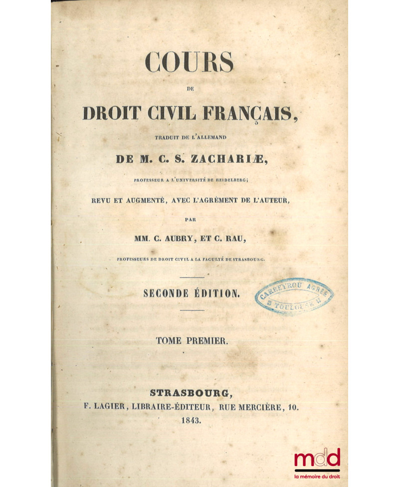Très rare exemplaire de la deuxième édition du traité d’Aubry et Rau, qui est encore qualifiée de traduction de celui de Zachariæ alors qu’on sait que dès l’époque il contenait des développements supplémentaires substantiels. L’ouvrage paraît simultanément à Strasbourg, Paris et Bruxelles. Dans cette édition le texte est encore marqué par ses origines allemandes, non seulement au fond, mais également sur la forme puisqu’il débute par une très substantielle introduction historique et une bibliographie typique de la doctrine germanique.