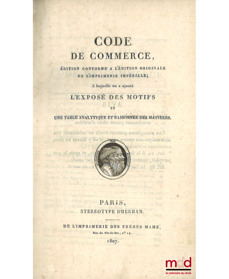 CODE DE COMMERCE, Édition conforme à l’édition originale de l’Imprimerie Impériale ; à laquelle on a ajouté l’exposé des motifs et une Table analytique et raisonnée des matières
