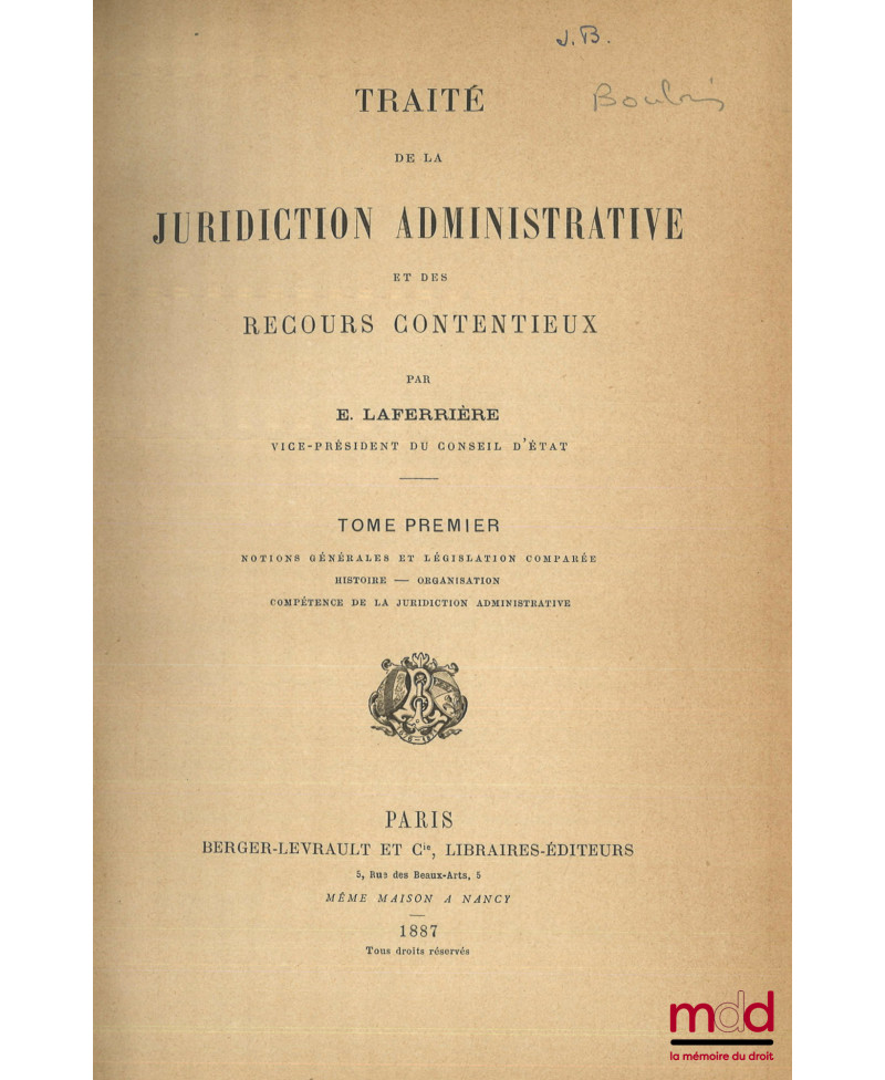 TRAITÉ DE LA JURIDICTION ADMINISTRATIVE ET DES RECOURS CONTENTIEUX :t. I : Notions générales et législation comparée - Histoire - Organisation - Compétence de la juridiction administrative ;t. II : Compétence (suite) - Marchés et autre contrats - Dommages - Responsabilité de l’État - Traitements et pensions - Contributions directes - Élections - Recours pour excès de pouvoir - Interprétation - Contraventions de grande voirie