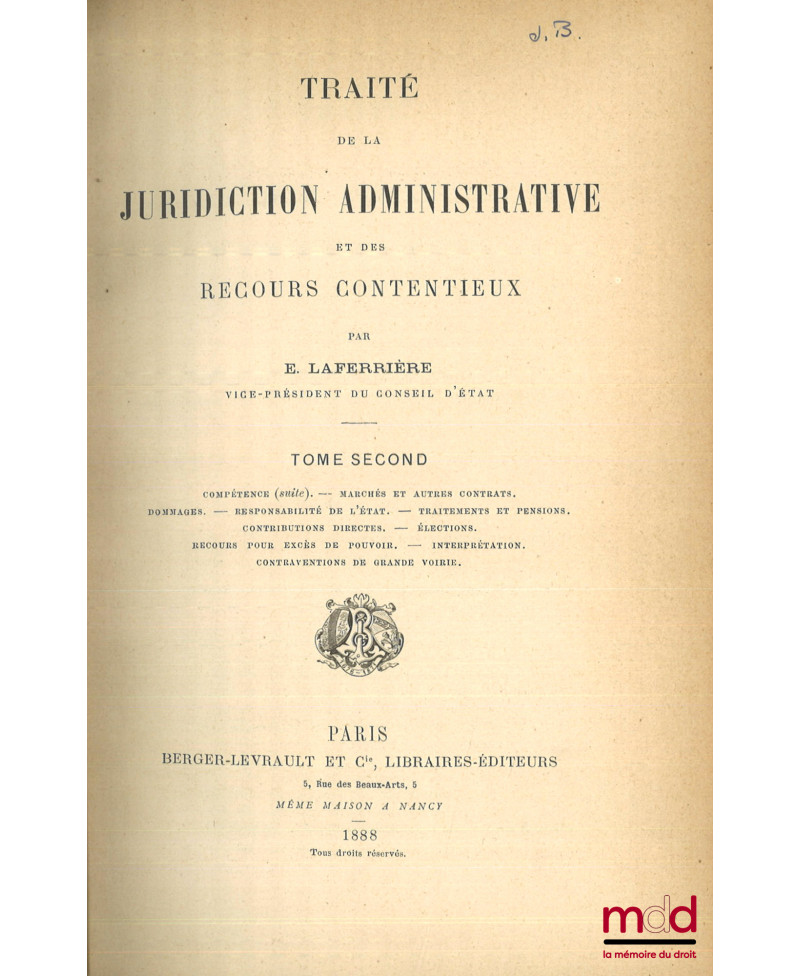 L’exemplaire ici présenté du fameux traité de juridiction administrative revêt l’intérêt de faire partie de l’édition qui n’a pas bénéficié d’une réédition récente. Or, pourtant, réalisée au tournant du siècle, la réflexion de Laferrière apparaît nettement enrichie par les apports du droit positif.