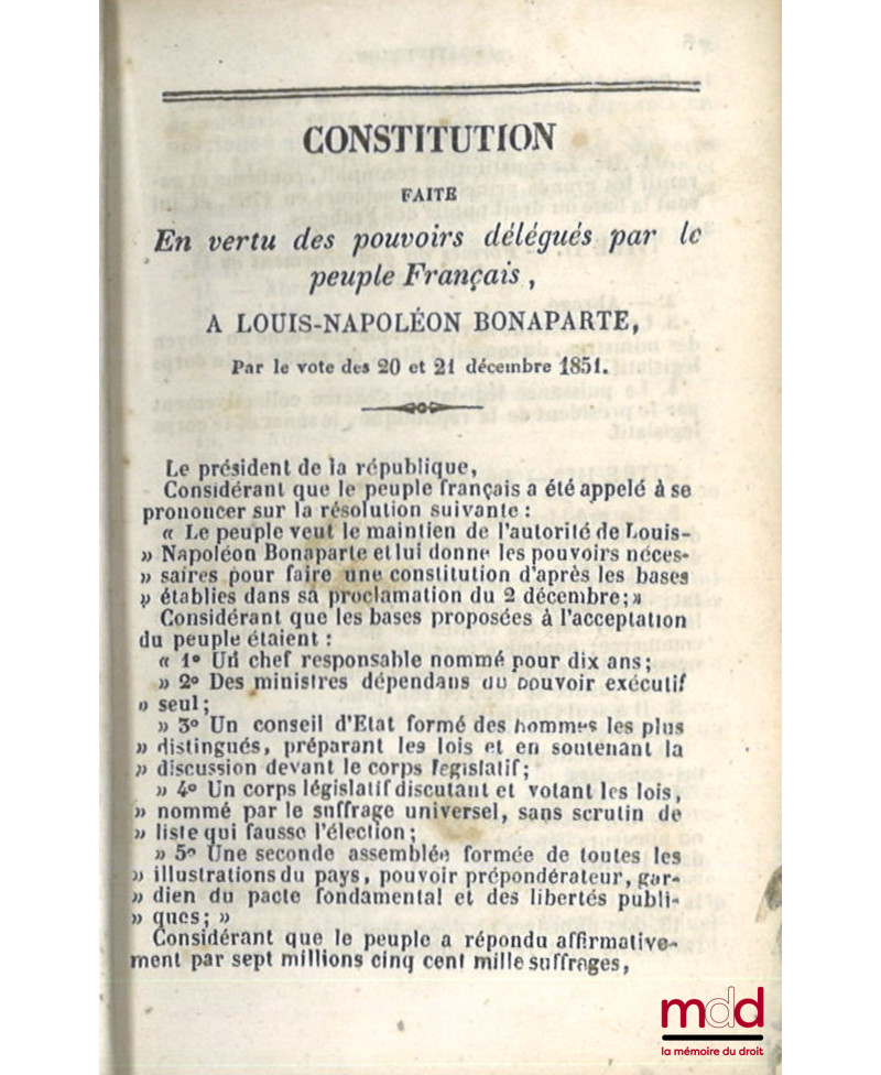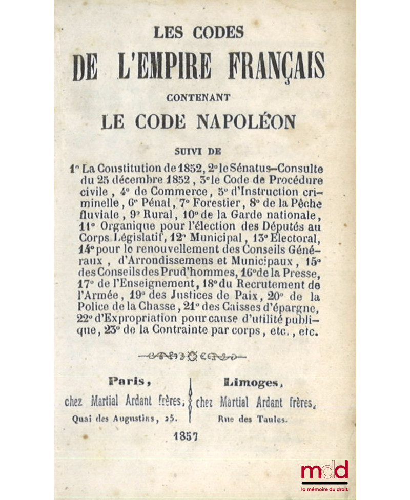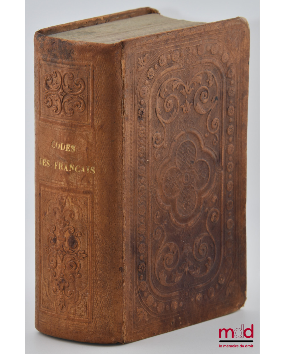 LES CODES DE L’EMPIRE FRANÇAIS contenant le CODE NAPOLÉON, Suivi de 1° La constitution de 1852, 2° Le Sénatus-Consulte du 25 décembre 1852, 3° le Code de Procédure civile, 4° de Commerce, 5° d’Instruction criminelle, 6° Pénal, 7° Forestier, 8° De la pêche fluviale, 9° Rural, 10° de la Garde nationale, 11° Organique pour l’élection des Députés au Corps législatif, 12° Municipal, 13° Électoral, 14° pour le renouvellement des Conseils Généraux, d’Arrondissement et Municipaux, 15° des Conseils des Prud’hommes, 16° de la presse, 17° de l’enseignement, 18° du recrutement de l’Armée, 19° des Justices de Paix, 20° de la Police de Chasse, 21° des Caisses d’épargne, 22° d’Expropriation pour cause d’utilité publique, 23° de la Contrainte par corps, etc., etc.