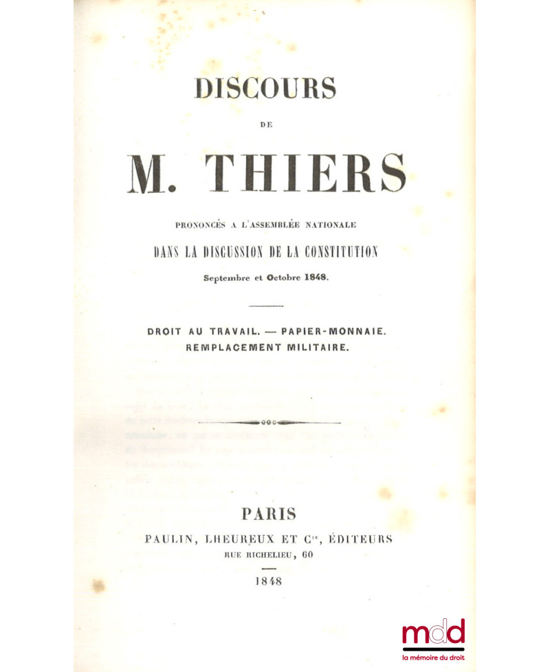 DISCOURS DE M. THIERS, Prononcés à l’Assemblée Nationale dans la discussion de la Constitution, Septembre et Octobre 1848 : Droit au travail. - Papier-monnaie. - Remplacement militaire