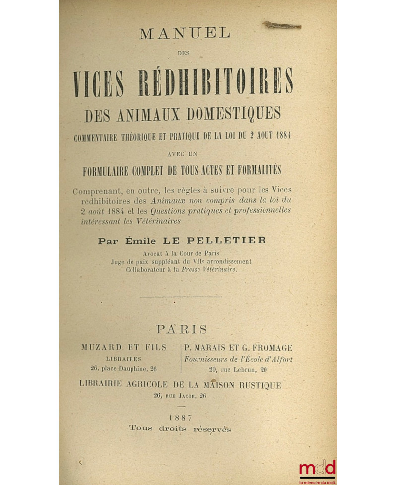 MANUEL DES VICES RÉDHIBITOIRES DES ANIMAUX DOMESTIQUES. COMMENTAIRE THÉORIQUE ET PRATIQUE DE LA LOI DU 2 AOÛT 1884 avec un FORMULAIRE COMPLET DE TOUS ACTES ET FORMALITÉS, Comprenant en outre, les règles à suivre pour les Vices rédhibitoires des Animaux non compris dans la loi du 2 août 1884 et les Questions pratiques et professionnelles intéressant les Vétérinaires