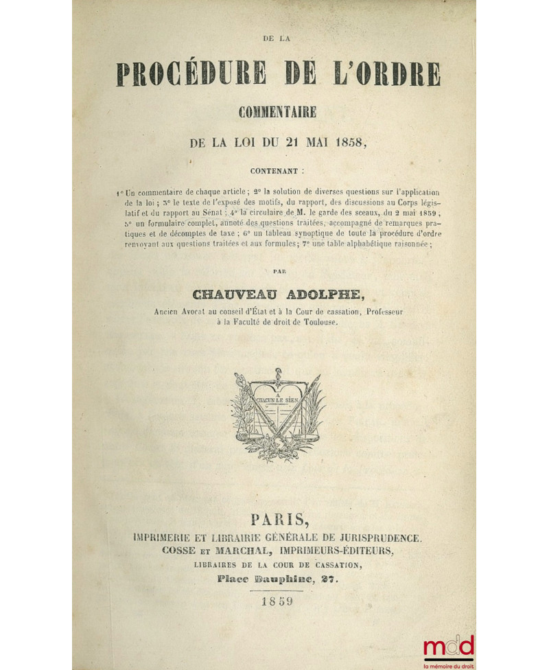 DE LA PROCÉDURE DE L’ORDRE, COMMENTAIRE DE LA LOI DU 21 MAI 1858, art. 749 à 779 ; Contenant 1° Un commentaire de chaque article ; 2° La solution de diverses questions sur l’application de la loi ; 3° Le texte de l’exposé des motifs, du rapport, des discussions au Corps législatif et du rapport au Sénat ; 4° La circulaire de M. le Garde des Sceaux, du 2 mai 1859 ; 5° Un formulaire complet, annoté des questions traitées, accompagné de remarques pratiques et de décompte de taxe ; 6° Un tableau synoptique de toute la procédure d’ordre renvoyant aux questions traitées et aux formules ; 7° Une table alphabétique raisonnée