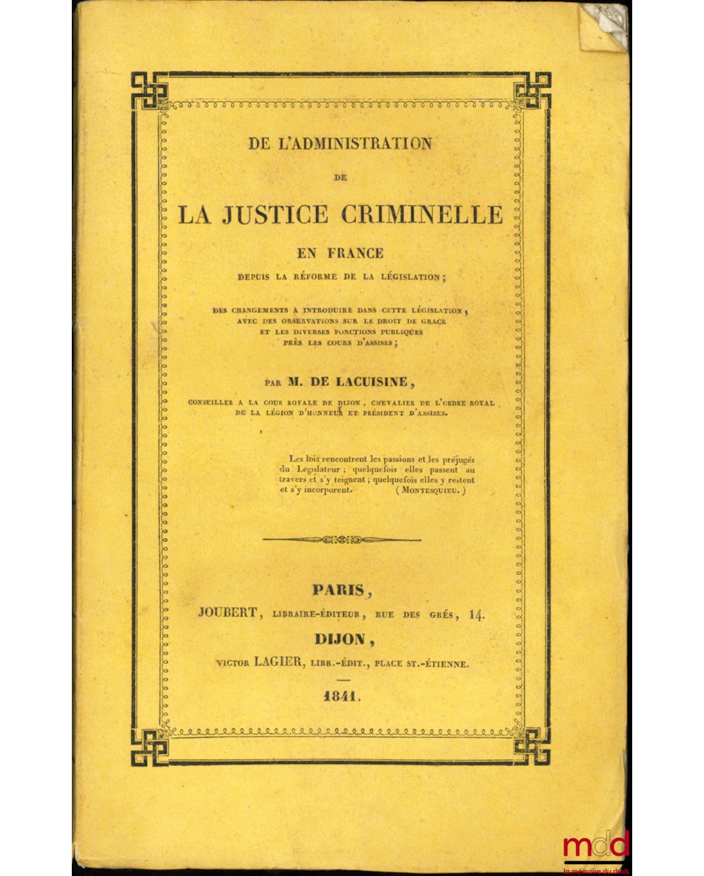 Texte sévère qui conteste la libéralisation du Code pénal organisée par la loi de 1832 et, plus fondamentalement, les premiers éléments de la sociologie pénale et de la criminologie : "Au lieu de cette horreur du crime si profondément enracinée dans nos mœurs une pitié désordonnée pour les coupables et une indifférence froide pour la victime ont en quelque sorte altéré le caractère national et mit l’ordre en péril". Le propos se dirige également contre les avocats : "Couvrir d’un patronage irréfléchi tous les crimes et tous les intérêts, prostituer pour sauver les plus coupables hommes, des artifices de la parole, du mensonge et de la mauvaise foi, ou bien peut-être dans un commerce mystérieux des relations subalternes mendiant honteusement la défense et la faire entrer dans la composition d’un lucre prématuré…" tous accents qui ne sont pas absolument étrangers à certains discours contemporains.