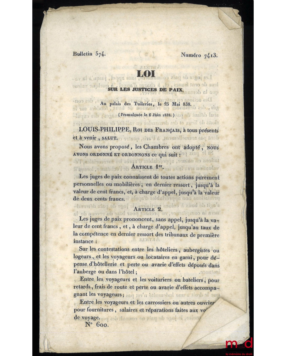 LOI SUR LES JUSTICES DE PAIX, numéro 7413, Au palais des Tuileries, le 25 Mai [1]838 (Promulguée le 6 Juin 1838), Bulletin 574, n° 600