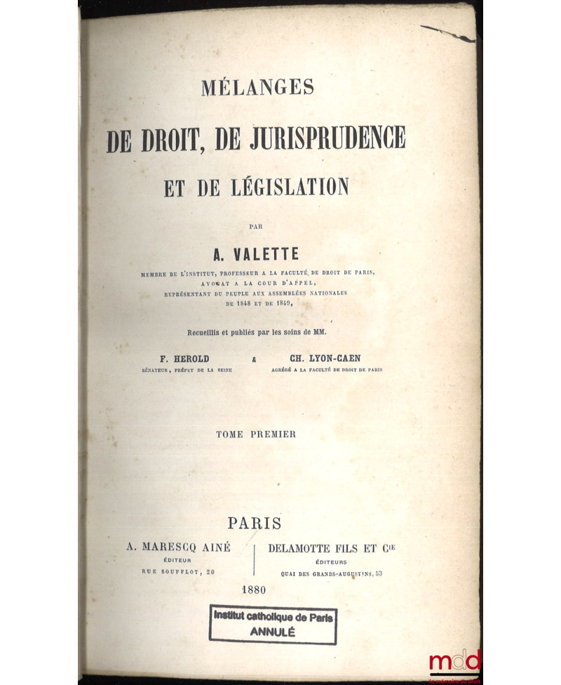 MÉLANGES DE DROIT, DE JURISPRUDENCE ET DE LÉGISLATION recueillis et publiés par les soins de MM. F. Herold et Ch. Lyon-Caen