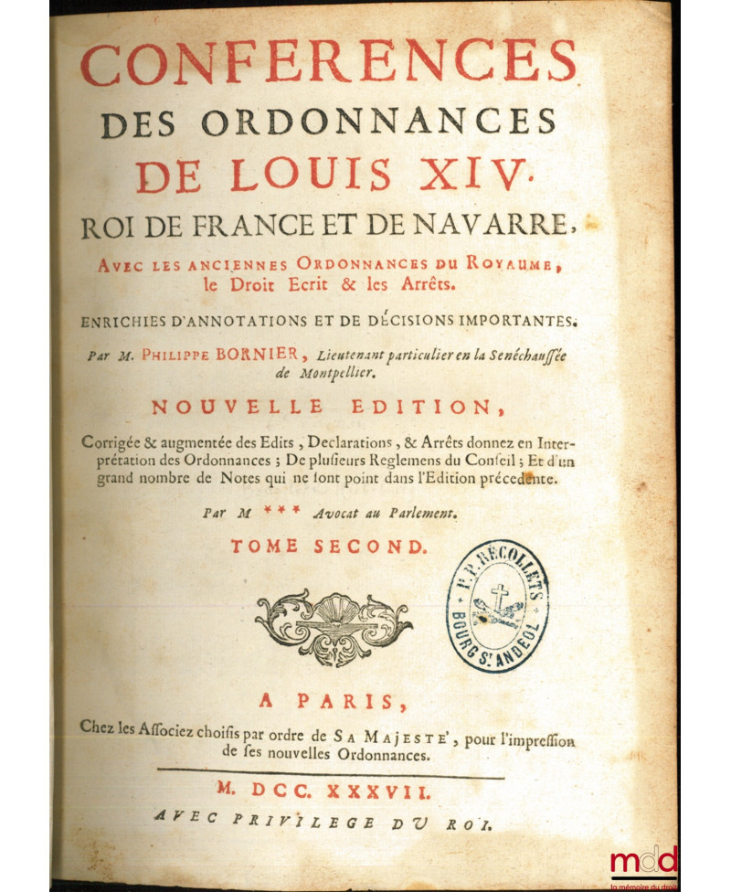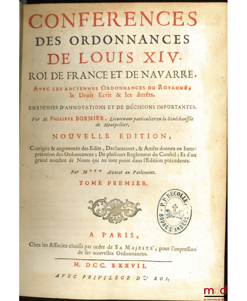 CONFÉRENCES DES ORDONNANCES DE LOUIS XIV, Roy de France et de Navarre, avec les anciennes ordonnances du Royaume, le Droit Écrit & les Arrêts, enrichies d’annotations et de décisions importantes, Nouvelle éd., corrigée & augmentée des Édits, Déclarations, & Arrêts donnez en Interprétation des Ordonnances ; de plusieurs règlemens du Conseil ; Et d’un grand nombre de Notes qui ne sont point dans l’Édition précédente par M.*** (Bourdot de Richebourg, Charles-Antoine), Avocat au Parlement