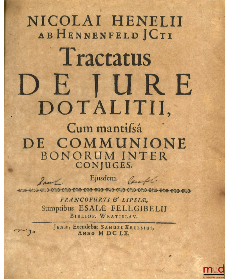 TRACTATUS DE JURE DOTALITII, Cum mantissâ de communione bonorum inter conjuges. Ejusdem.