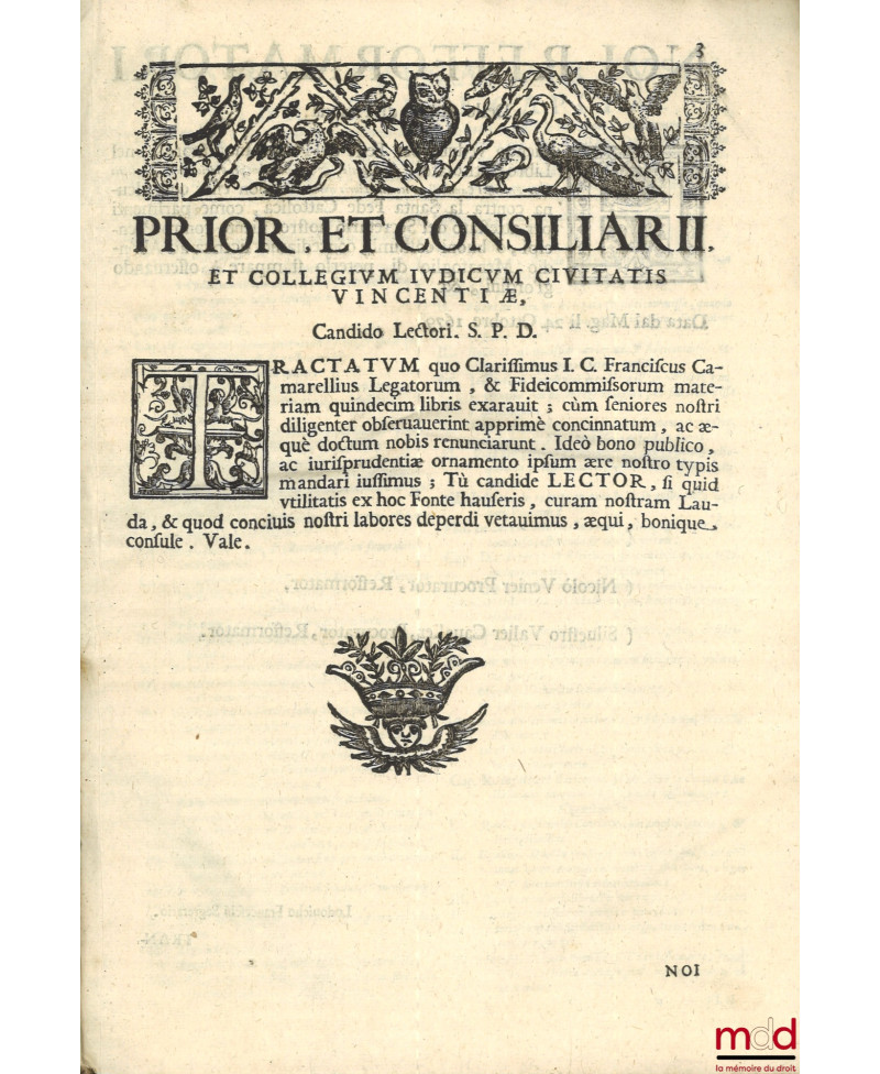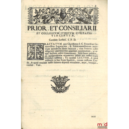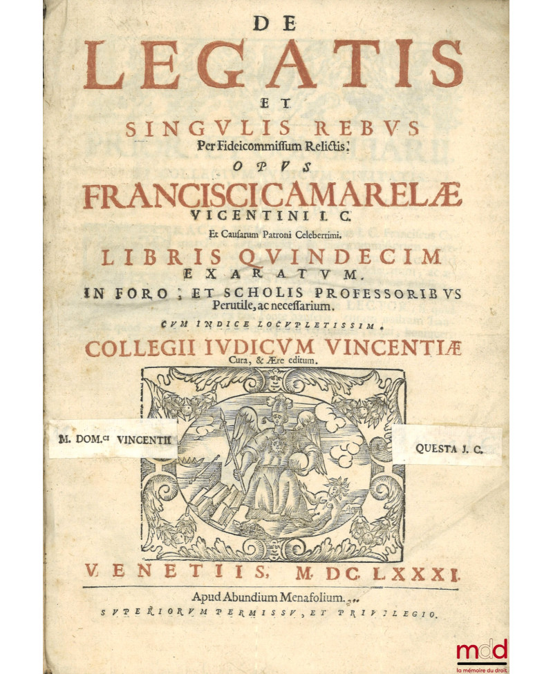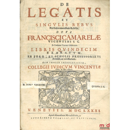 DE LEGATIS ET SINGULIS REBUS PER FIDEICOMMISSUM RELICTIS, Libris quindecim exaratum, in foro ; et scholis professoribus Perutile, ac necessarium. Cum indice locupletissim. Collegii judicum Vincentiae Cura et Ære editum.