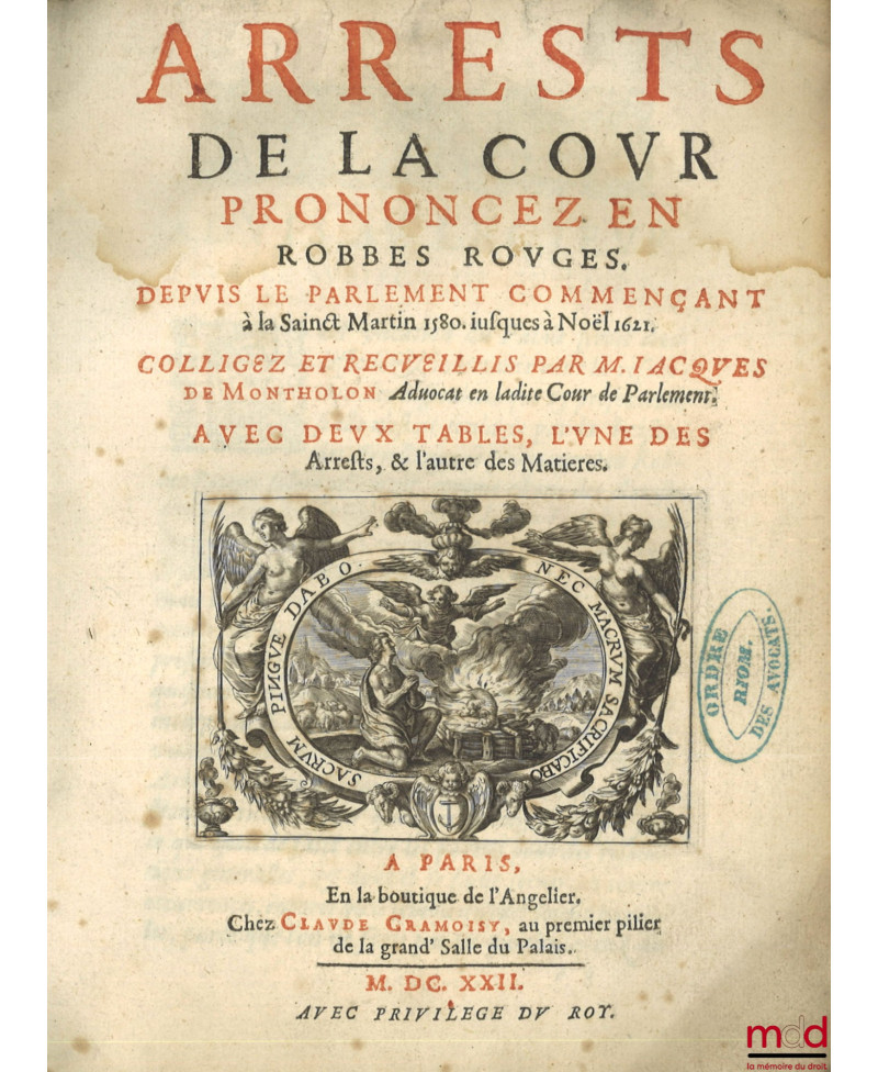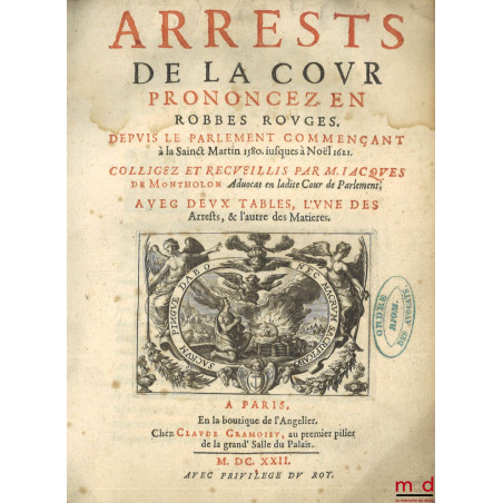 ARRESTS DE LA COUR PRONONCEZ EN ROBBES ROUGES. Depuis le Parlement commençant à la Saint Martin 1580 jusqu’à Noël 1621. Colligez et recueillis par M. Jacques de Montholon, Avec deux tables, l’une des arrêts, et l’autre des matières.