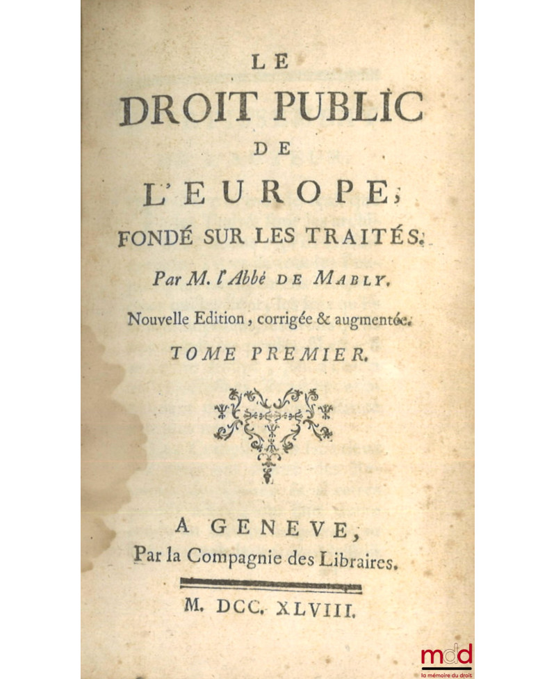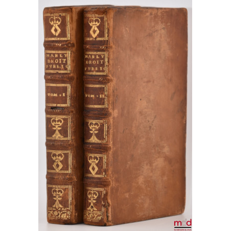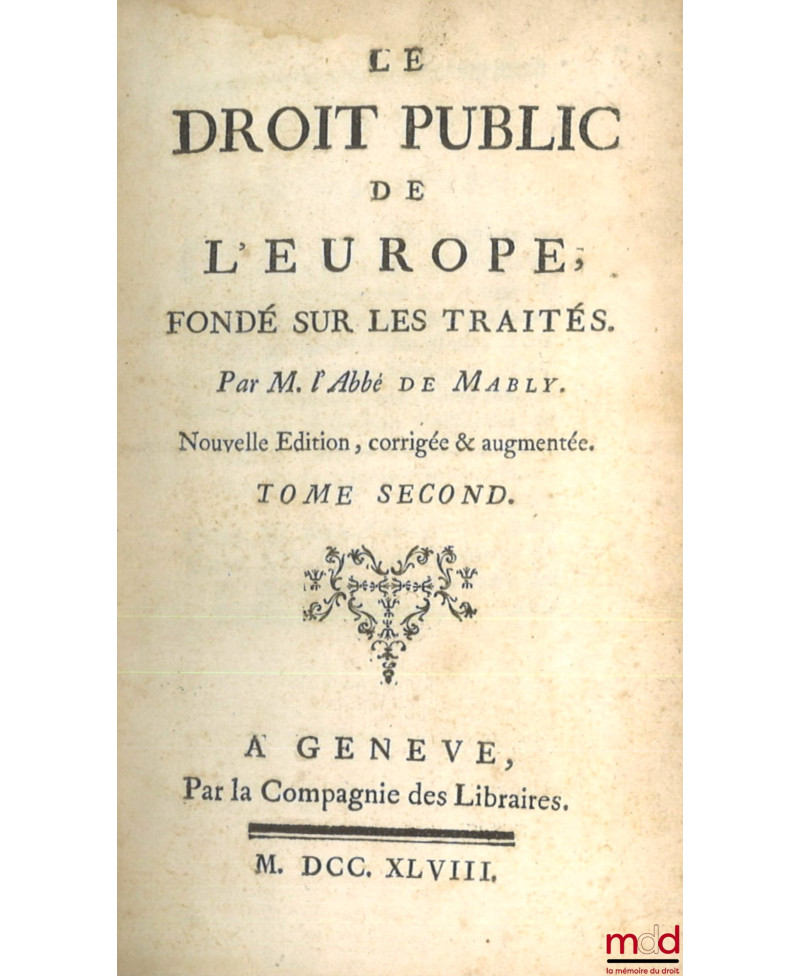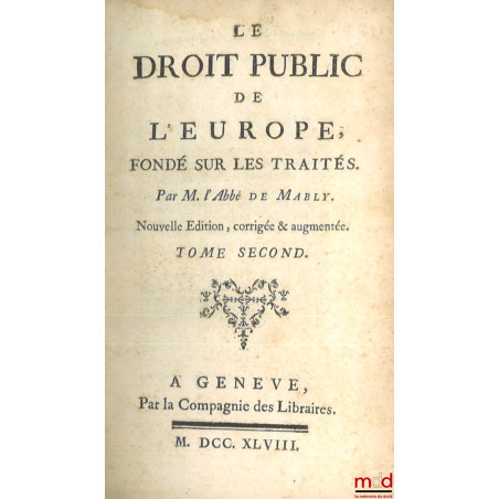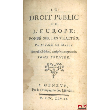 (Dupin n° 175). Il ne faut pas voir dans cet ouvrage une étude du droit des gens à la manière de Grotius ou Vattel, il s’agit en réalité d’une analyse historique des traités de paix et de commerce entre les différents pays de l’Europe et l’empire ottoman depuis la paix de Westphalie jusqu’en 1750, dont on sait qu’elle a marqué un point d’inflexion important dans le droit des traités faisant émerger le « principe de l’équilibre », c’est-à-dire du balancement des forces entre les États européens, chaque accroissement de puissance d’un prince autorisant les autres à réclamer une contrepartie (v. Scelle, Droit international public 1944, n° 16). Mably décrit l’évolution géopolitique de l’Europe jusqu’à la paix de Paris de 1763. C’est à ce titre une des meilleures sources de l’histoire internationale de l’Europe de cette époque. Bel exemplaire.