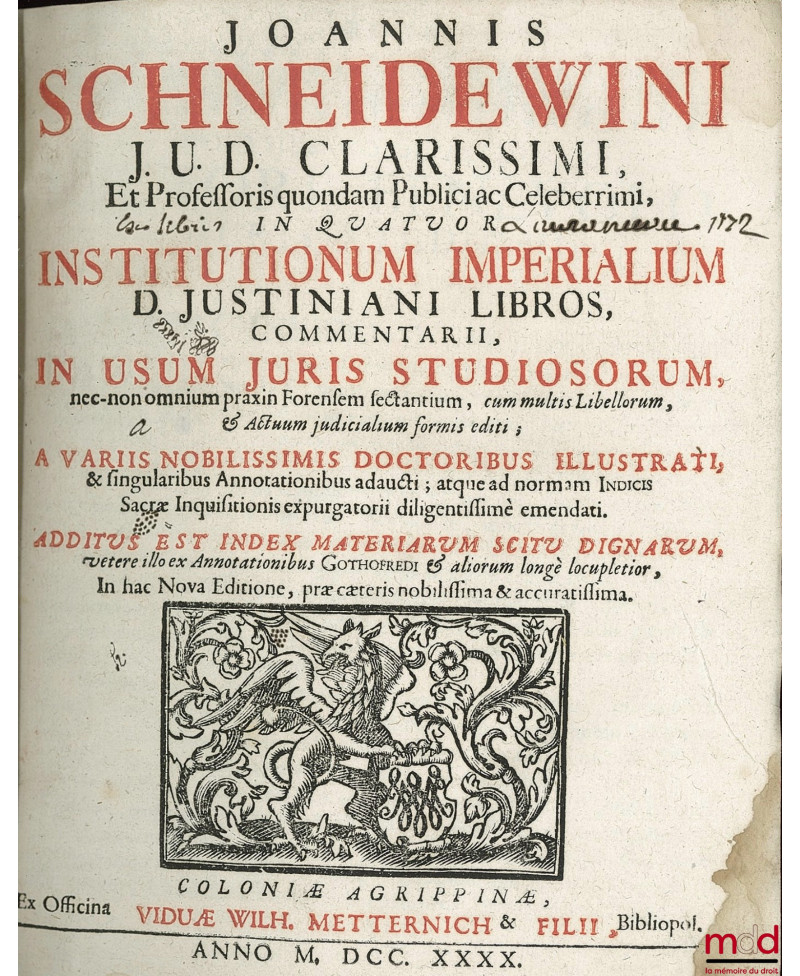 JOANNIS SCHNEIDEWINI (…) IN QUATUOR INSTITUTIONUM IMPERIALIUM D. JUSTINIANI LIBROS, COMMENTARII, IN USUM JURIS STUDIOSORUM (…) in hac nova editione