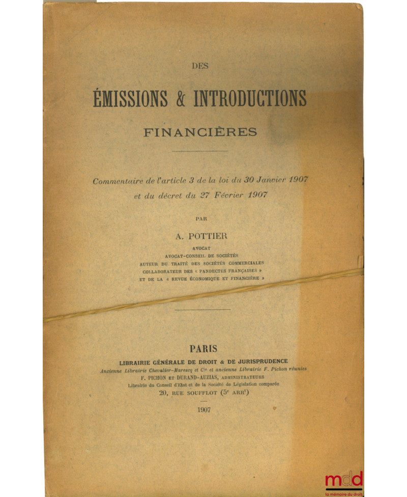 DES ÉMISSION & INTRODUCTIONS FINANCIÈRES, commentaire de l?article 3 de la loi du 30 janvier 1907 et du décret du 27 février ...