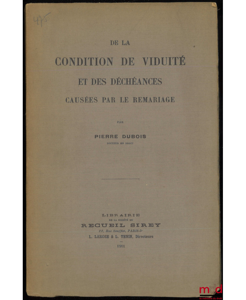 DE LA CONDITION DE VIDUITÉ ET DES DÉCHÉANCES CAUSÉES PAR LE REMARIAGE