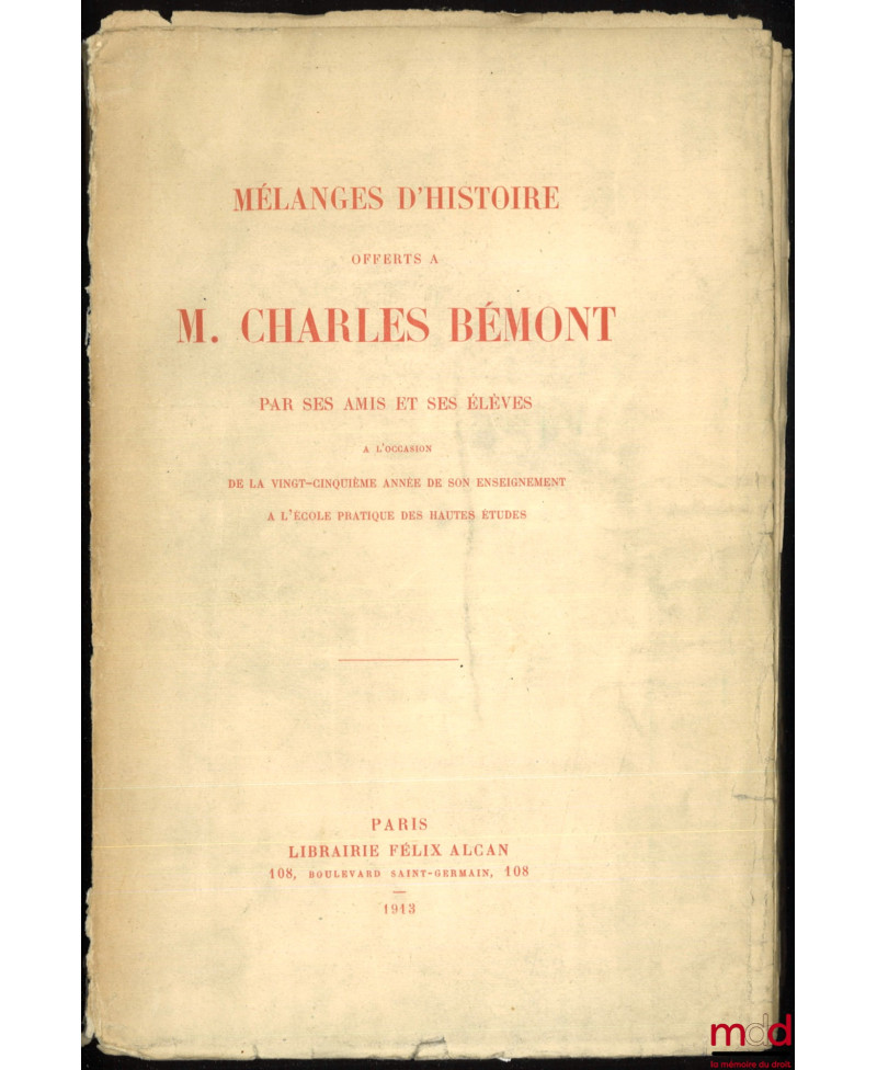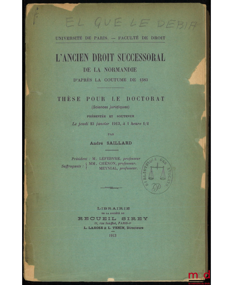 L’ANCIEN DROIT SUCCESSORAL DE LA NORMANDIE D’APRÈS LA COUTUME DE 1583, Thèse pour le Doctorat, présentée et soutenue le 23 janvier 1913,...