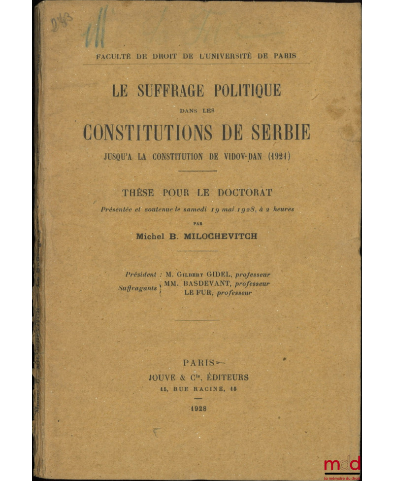 LE SUFFRAGE POLITIQUE DANS LES CONSTITUTIONS DE SERBIE, Jusqu’à la constitution de Vidov-Dan (1921), Thèse (Président : Gilbert Gidel ;...