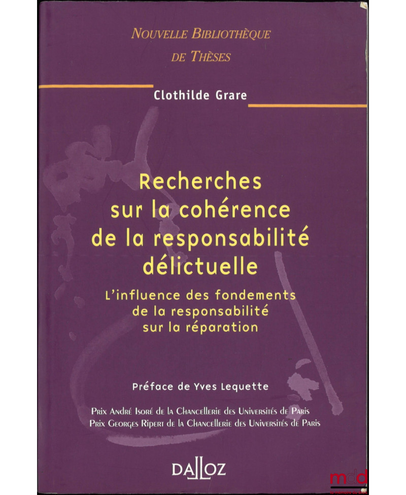 RECHERCHES SUR LA COHÉRENCE DE LA RESPONSABILITÉ DÉLICTUELLE, L’influence des fondements de le responsabilité sur la réparation, Préface de Yves...