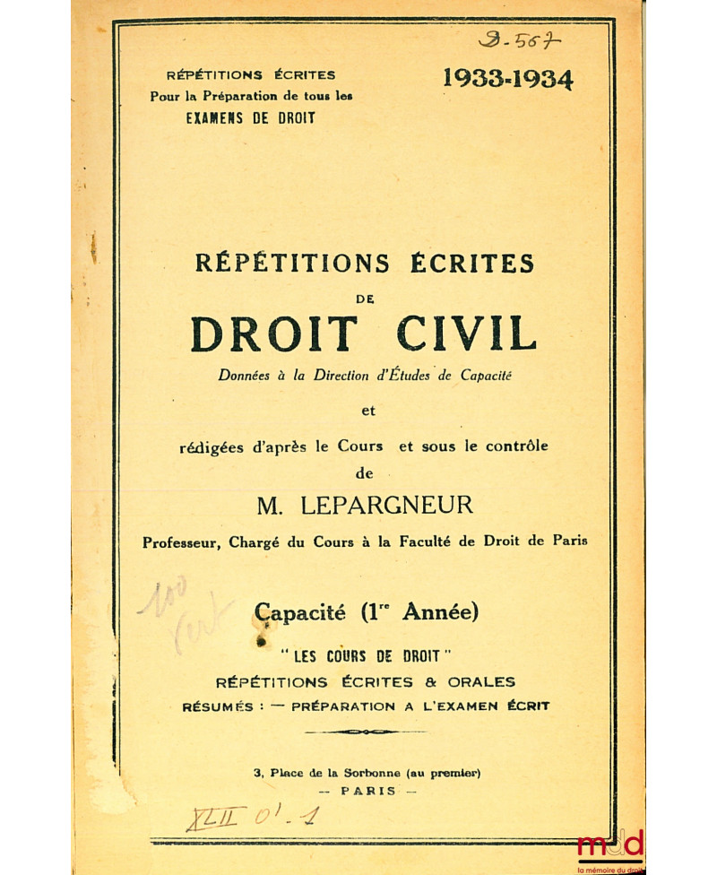 RÉPÉTITIONS ÉCRITES DE DROIT CIVIL, Capacité, 1ère année, 1933-1934
