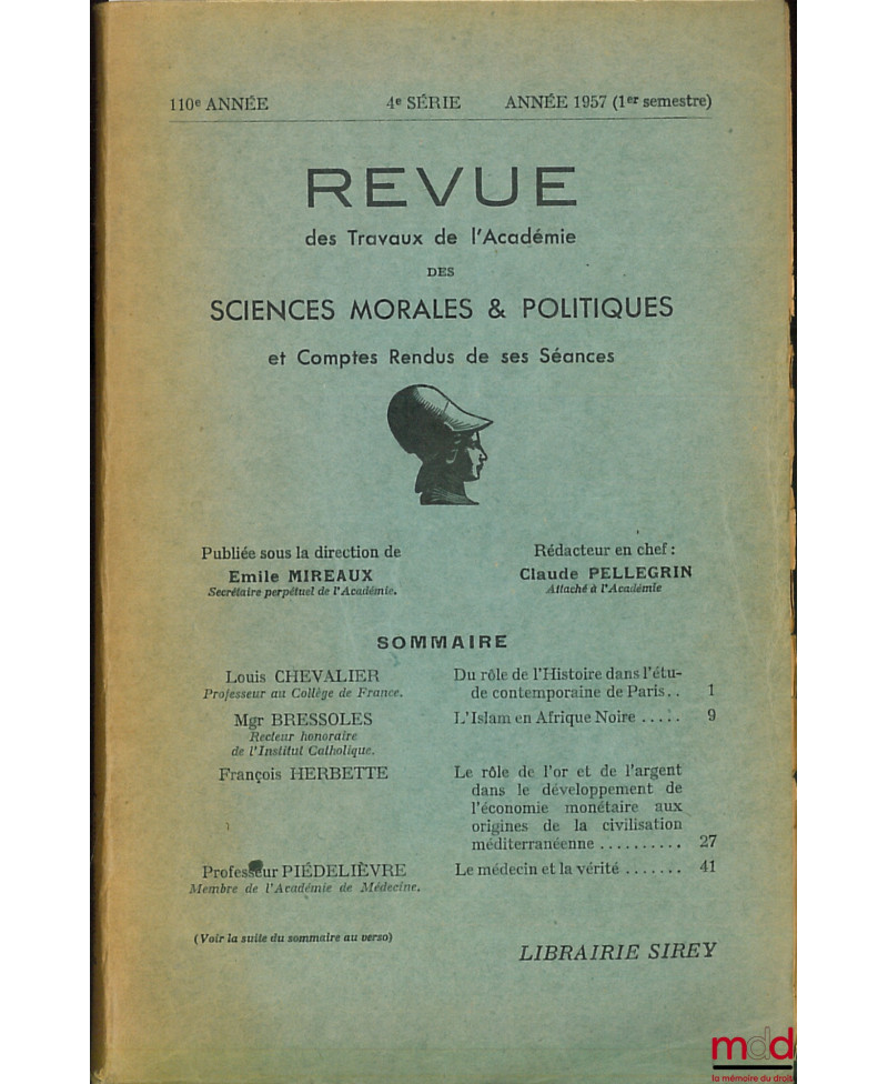 REVUE DES TRAVAUX DE L’ACADÉMIE DES SCIENCES MORALES ET POLITIQUES ET COMPTES RENDUS DE SES SÉANCES, 110ème année, 4ème série, année 1957 (1er...