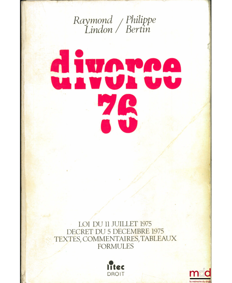 Aperçu Ajouter au panier Ajouter à vos souhaits Comparer Droit moderne (XX-XXIe siècles) LINDON (Raymond) et BERTIN (Philippe) DIVORCE 76, Loi du 11 juillet 1975. Décret du 5 décembre 1975, Textes, commentaires, tableaux, formules Prix DIVORCE 76, Loi du 11 juillet 1975. Décret du 5 décembre 1975, Textes, commentaires, tableaux, formules