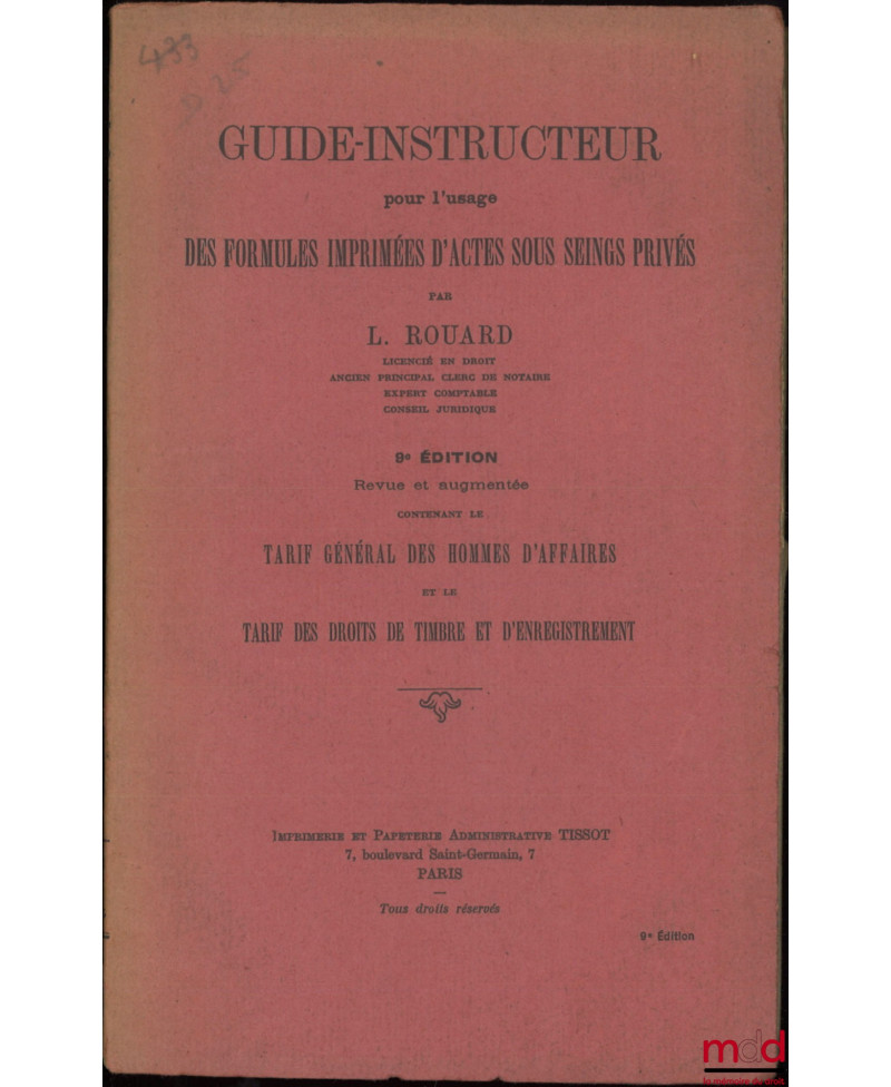 GUIDE-INSTRUCTEUR pour l’usage des formules imprimées d’actes sous seings privés, 9e éd. Revue et augmentée contenant le tarif général des hommes...