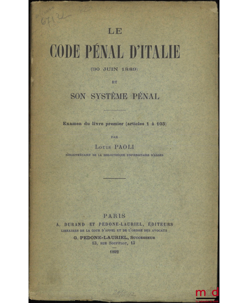 LE CODE PÉNAL D’ITALIE (30 JUIN 1889) ET SON SYSTÈME PÉNAL, Examen du livre premier (articles 1 à 103)