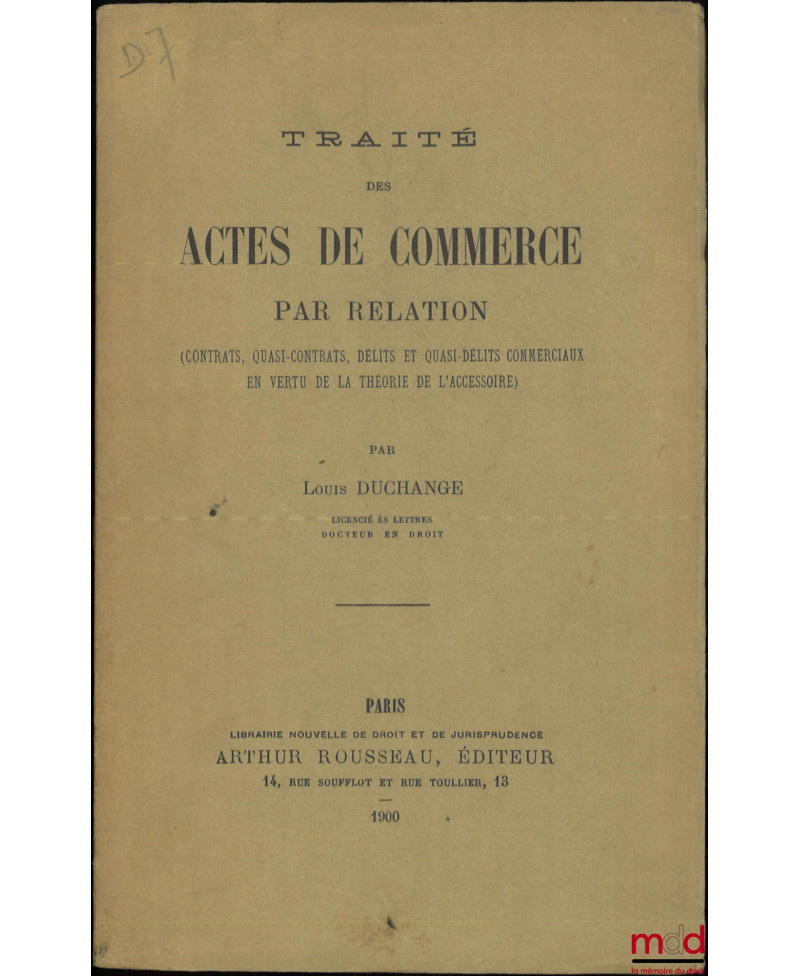 TRAITÉ DES ACTES DE COMMERCE PAR RELATION, (Contrats, quasi-contrats, délits et quasi-délits commerciaux en vertu de la théorie de l’accessoire)