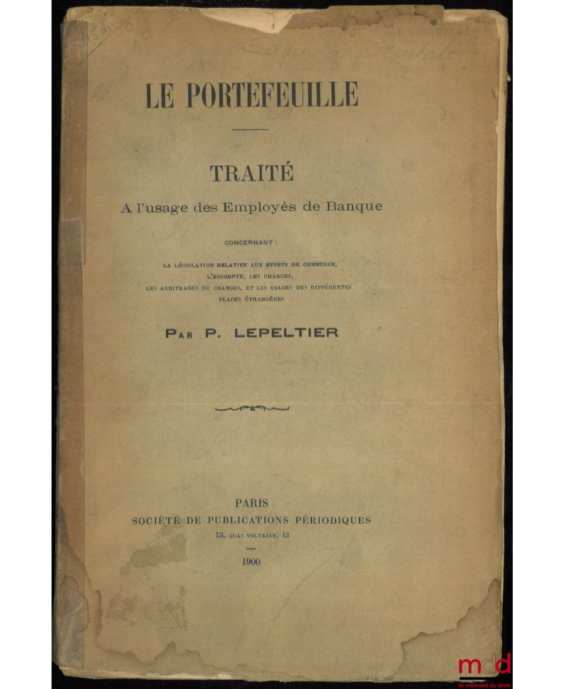 LE PORTEFEUILLE. TRAITÉ à l’usage des Employés de Banque concernant : la législation relative aux effets de commerce, l’escompte, les changes, les...